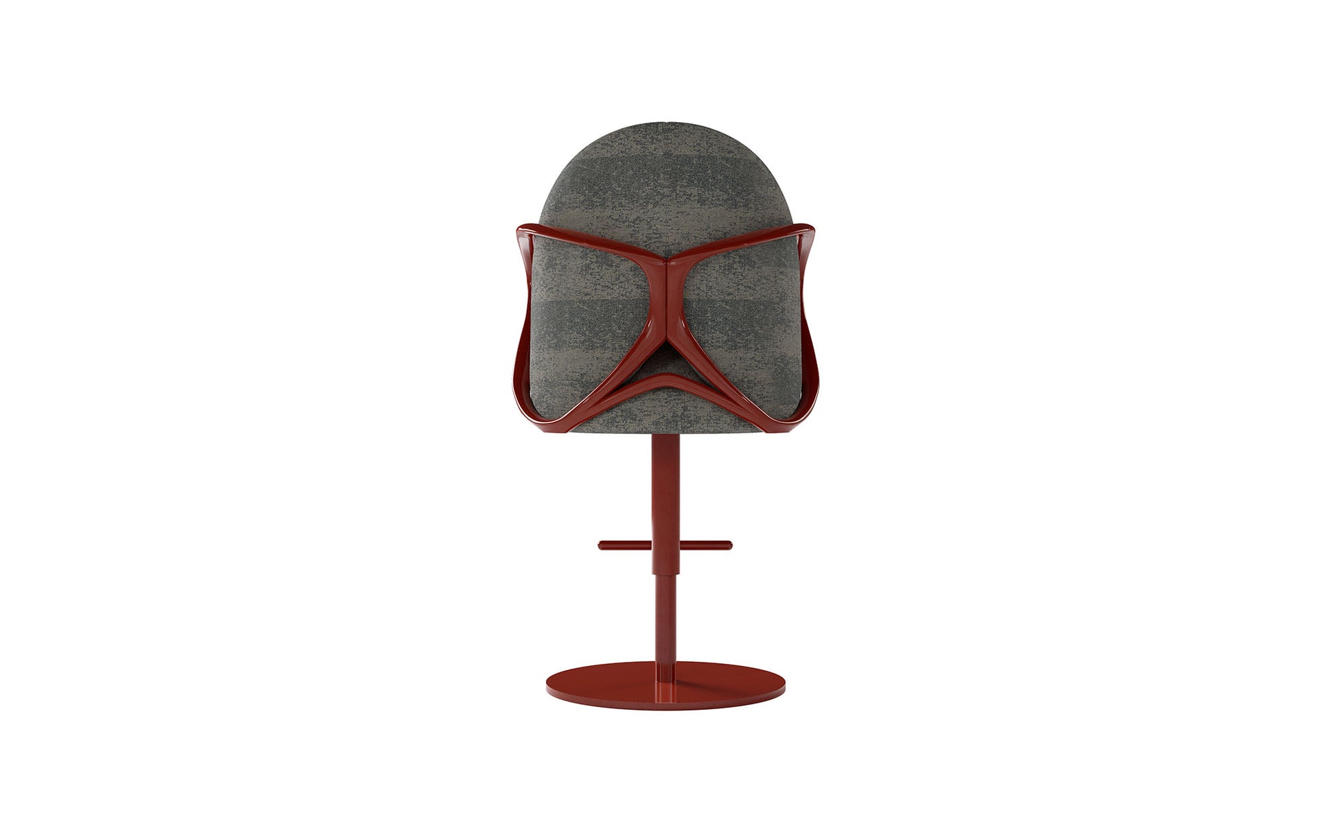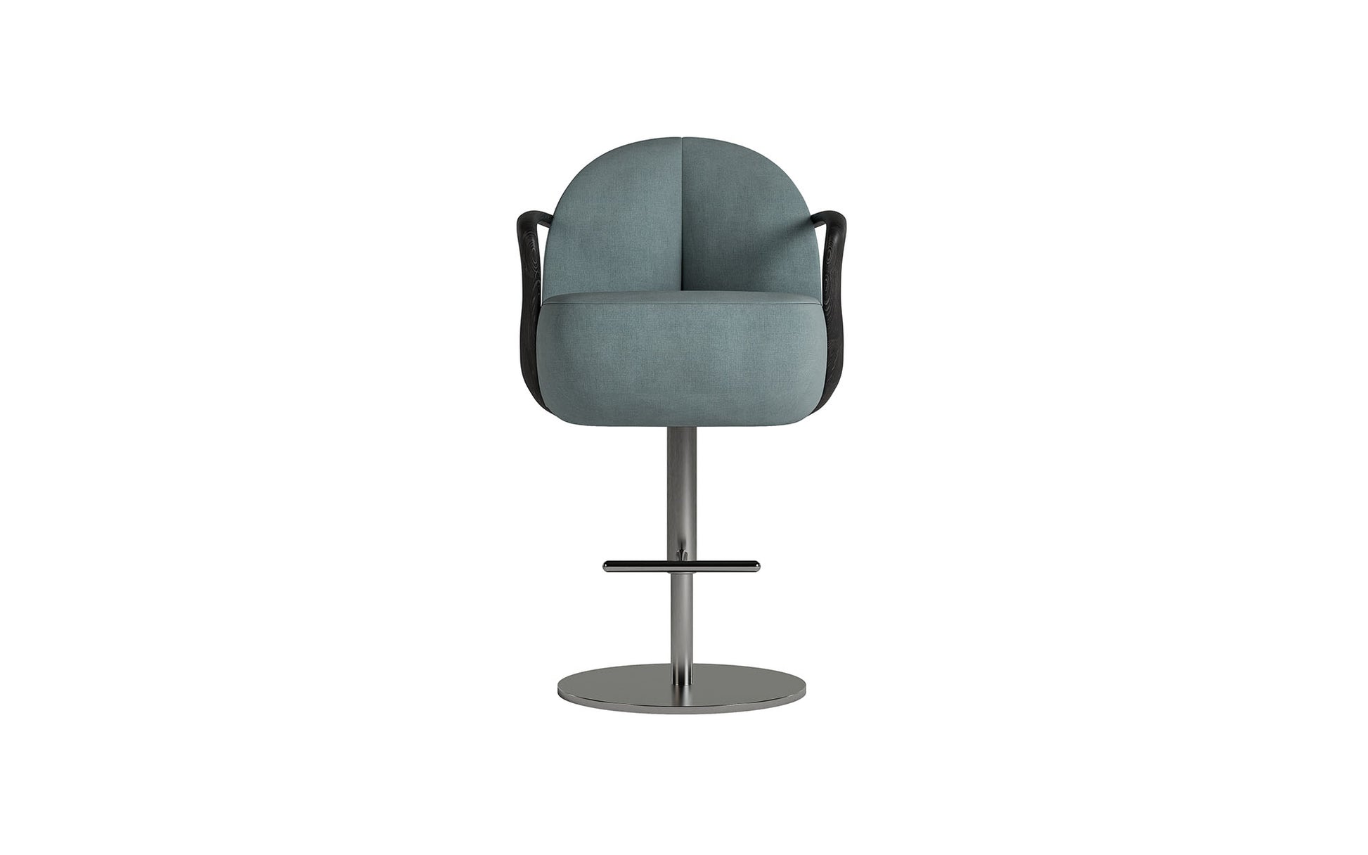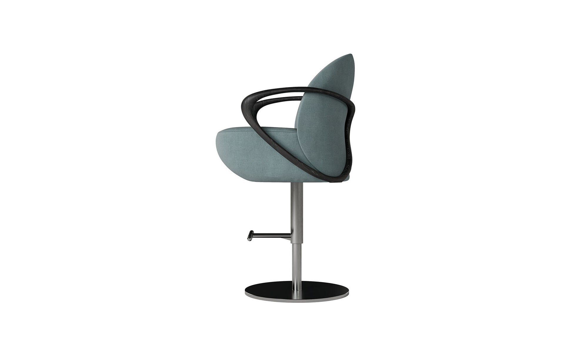 Counter-Bar Chair with adjustable height thanks to a spring mechanism, with base structure in satin finished steel. The structure frame of the seat is in smoked elm, natural walnut, or piano painting beech, and the structure of the back in curved plywood. The padding is in flexible multi-density polyurethane, covered with fibre. Upholstered in a selection of textured fabric or leather, fully removable and available in various colors.