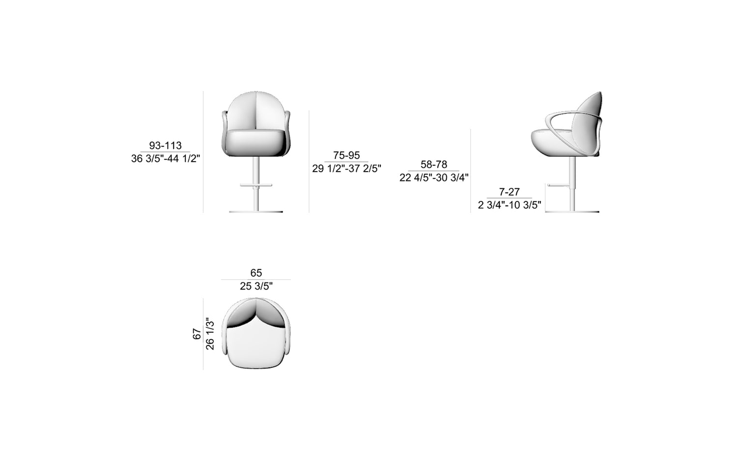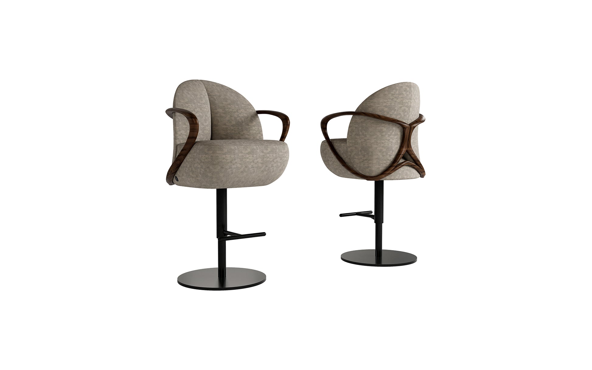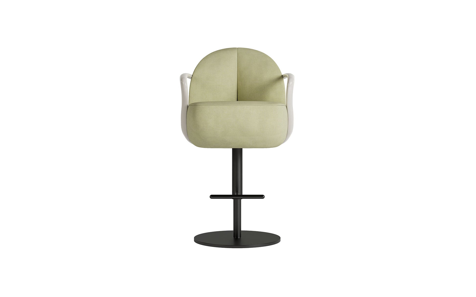 Counter-Bar Chair with adjustable height thanks to a spring mechanism, with base structure in satin finished steel. The structure frame of the seat is in smoked elm, natural walnut, or piano painting beech, and the structure of the back in curved plywood. The padding is in flexible multi-density polyurethane, covered with fibre. Upholstered in a selection of textured fabric or leather, fully removable and available in various colors.