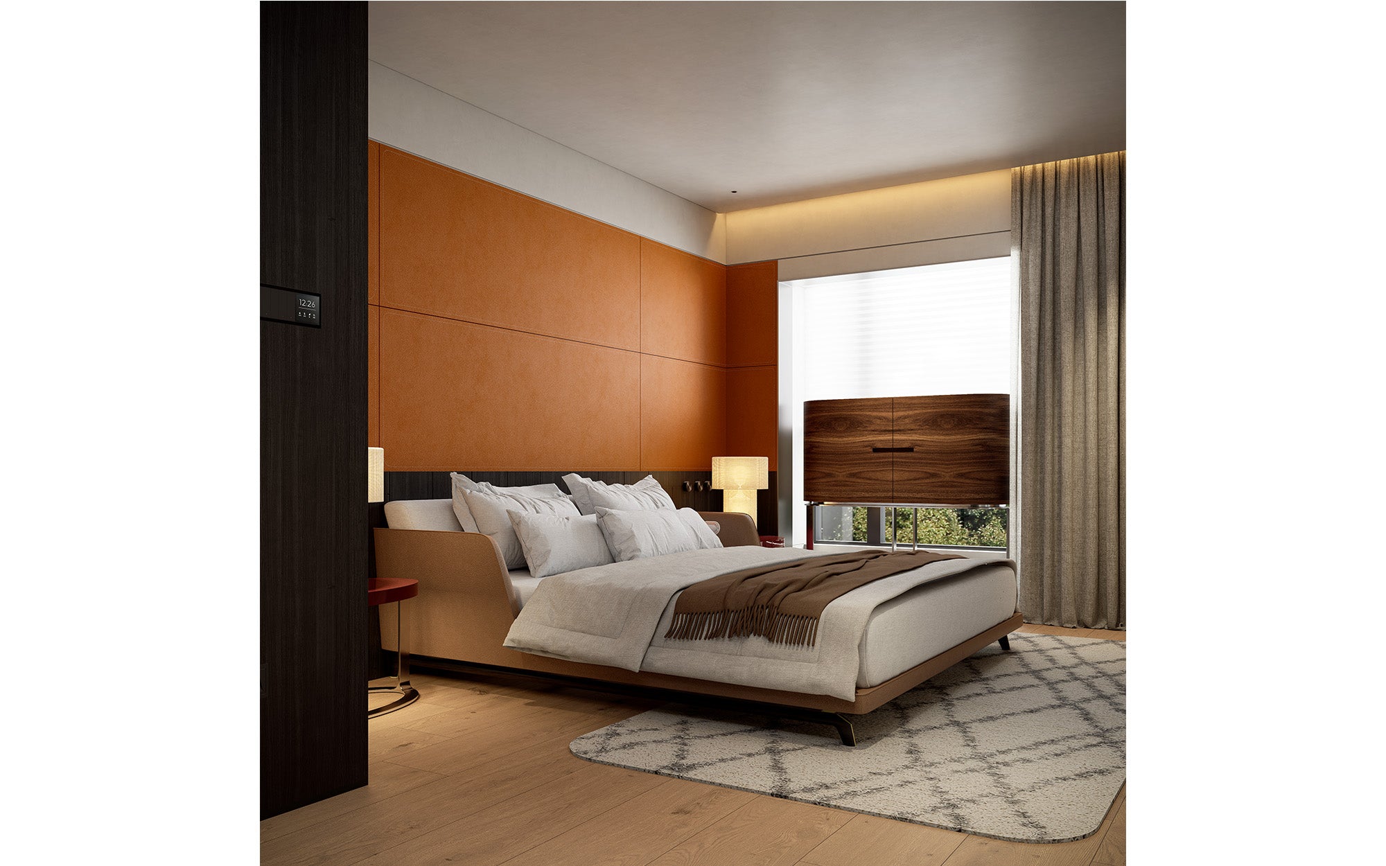 "G" Tall server is a sleek and elegant bar cabinet, two doors in wood. The interior is available in two versions: white painted Fiddleback Sycamore or gold leaf decoration. The bar cabinet is equipped with metal revolving trays painted in a bronze colour: these can be regulated in height and have glass tops and LED lights. The base is metal painted in a bronze colour. Ideal for living rooms, dining areas, or upscale lounges, it combines storage and presentation to create a refined wine-tasting experience.