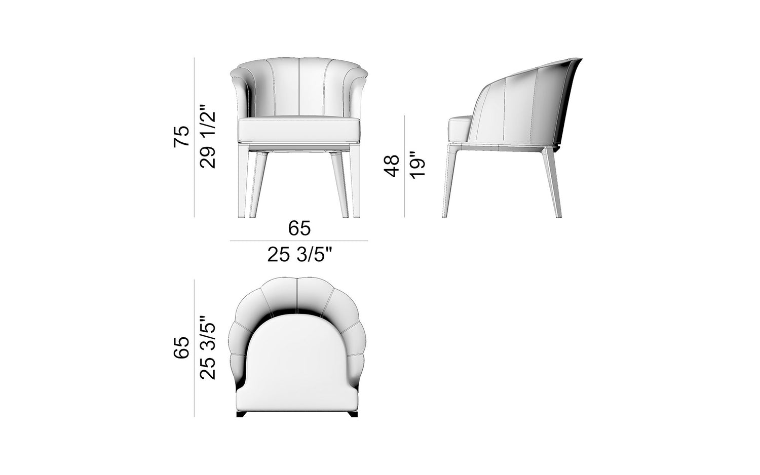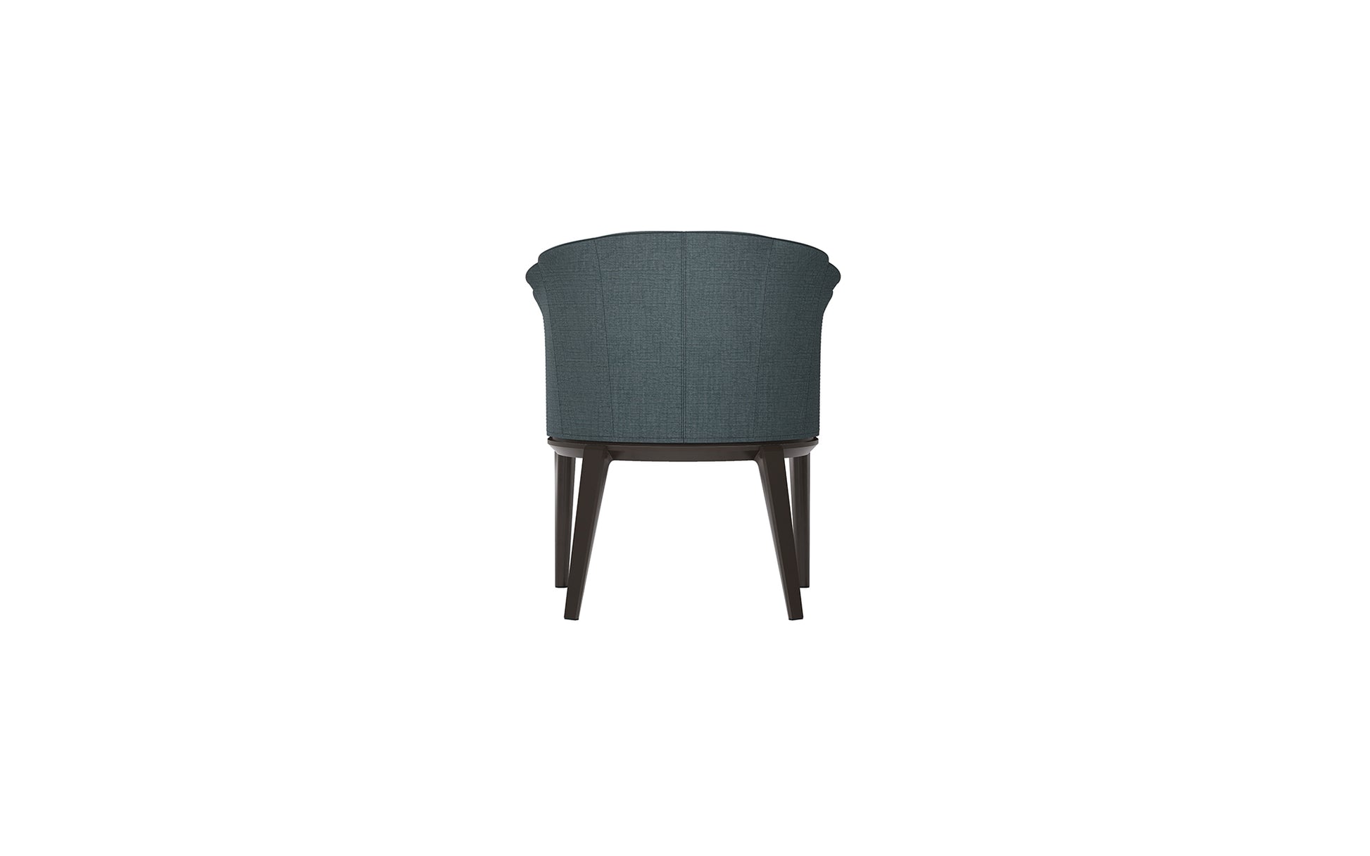 Laura armchair with base in smoked elm, natural walnut, or piano painting beech, and the structure of the back in curved plywood. The padding is in flexible multi-density polyurethane, covered with fibre. The upholstery of the back has special stripes, and can be in fabric or leather. It is available in various colors, all completely removable.