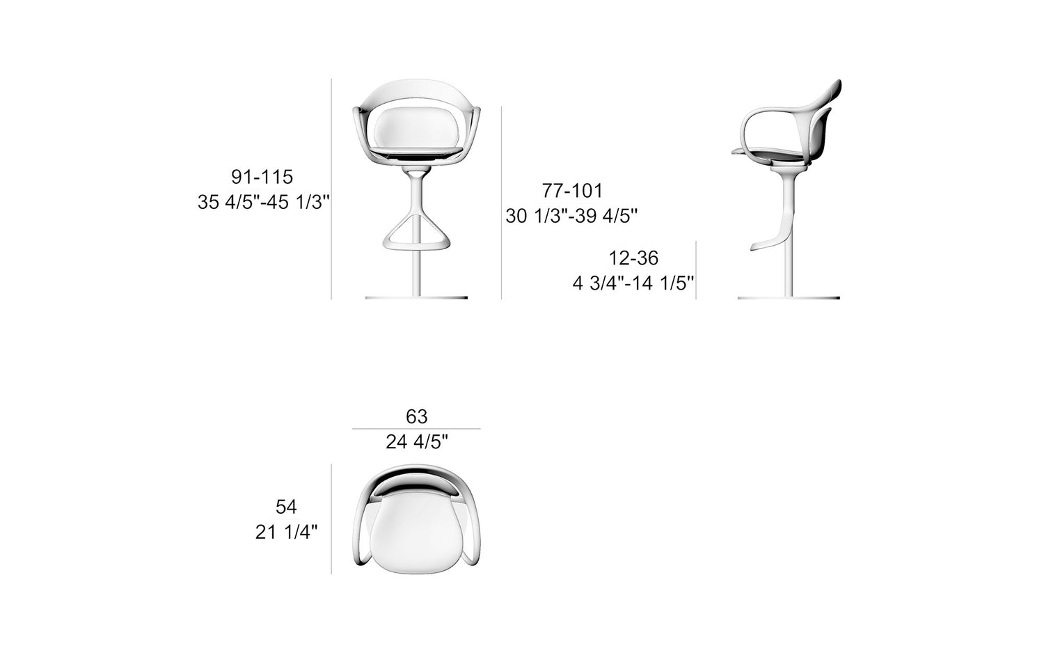 Counter-Bar Stool with base structure in satinfinished steel. The structure frame of the seat is in smoked elm, natural walnut, or piano painting beech, and the structure of the back in curved plywood. The padding is in flexible multi-density polyurethane, covered with fibre. Outer shell is in saddle leather or leather, the inner shell is in fabric. It is available in various colors.
