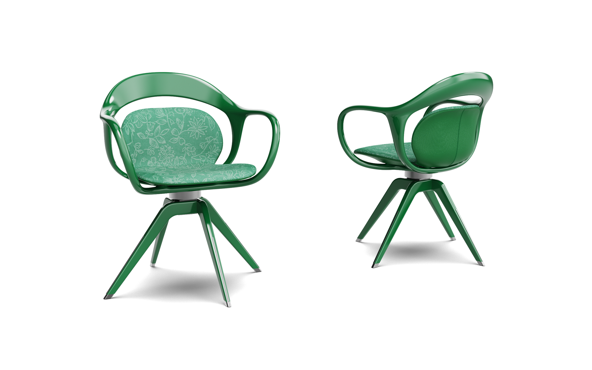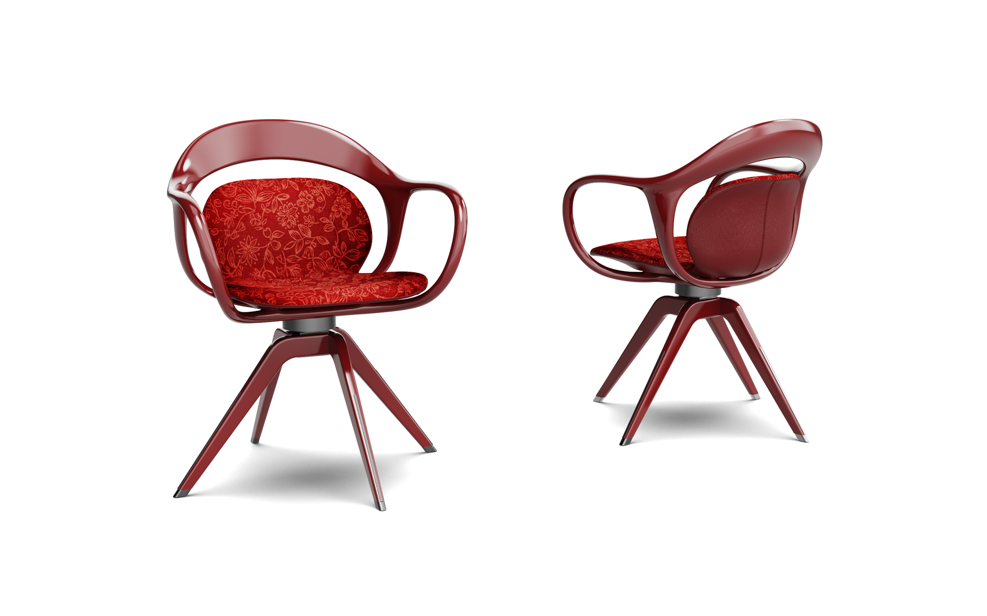 Swivel armchair with the structure frame in smoked elm, natural walnut, or piano painting birch, and the structure of the back in curved plywood. The padding is in flexible multi-density polyurethane, covered with fibre. The outer shell is in saddle leather or leather, the inner shell is in fabric. It is available in various colors.