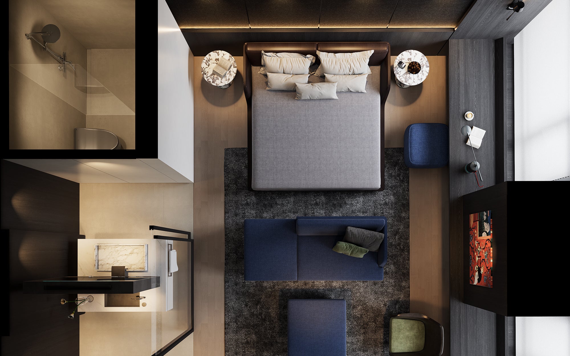 A series of beds in solid wood structure with inlaid metal and removable fabric or leather upholstery.