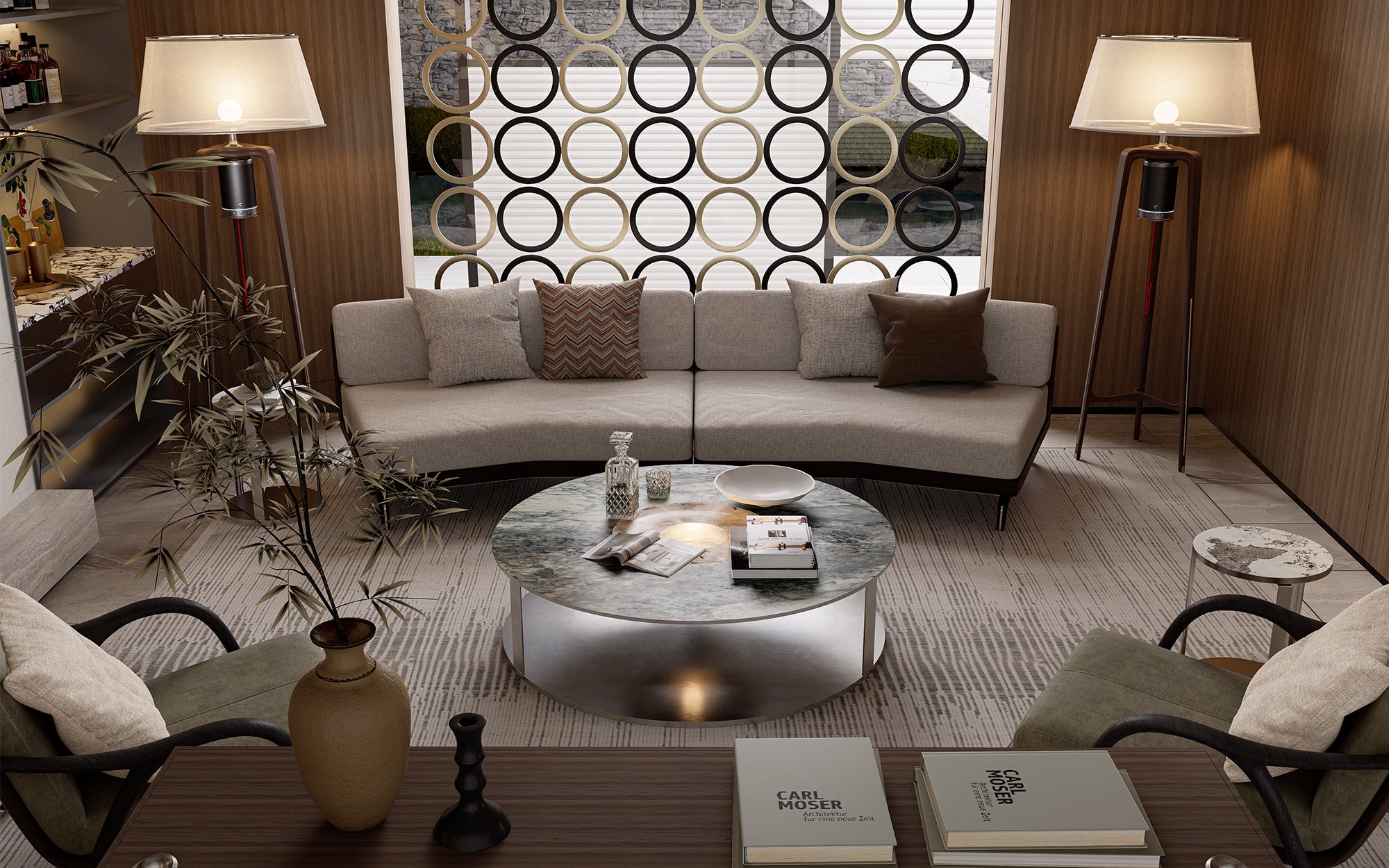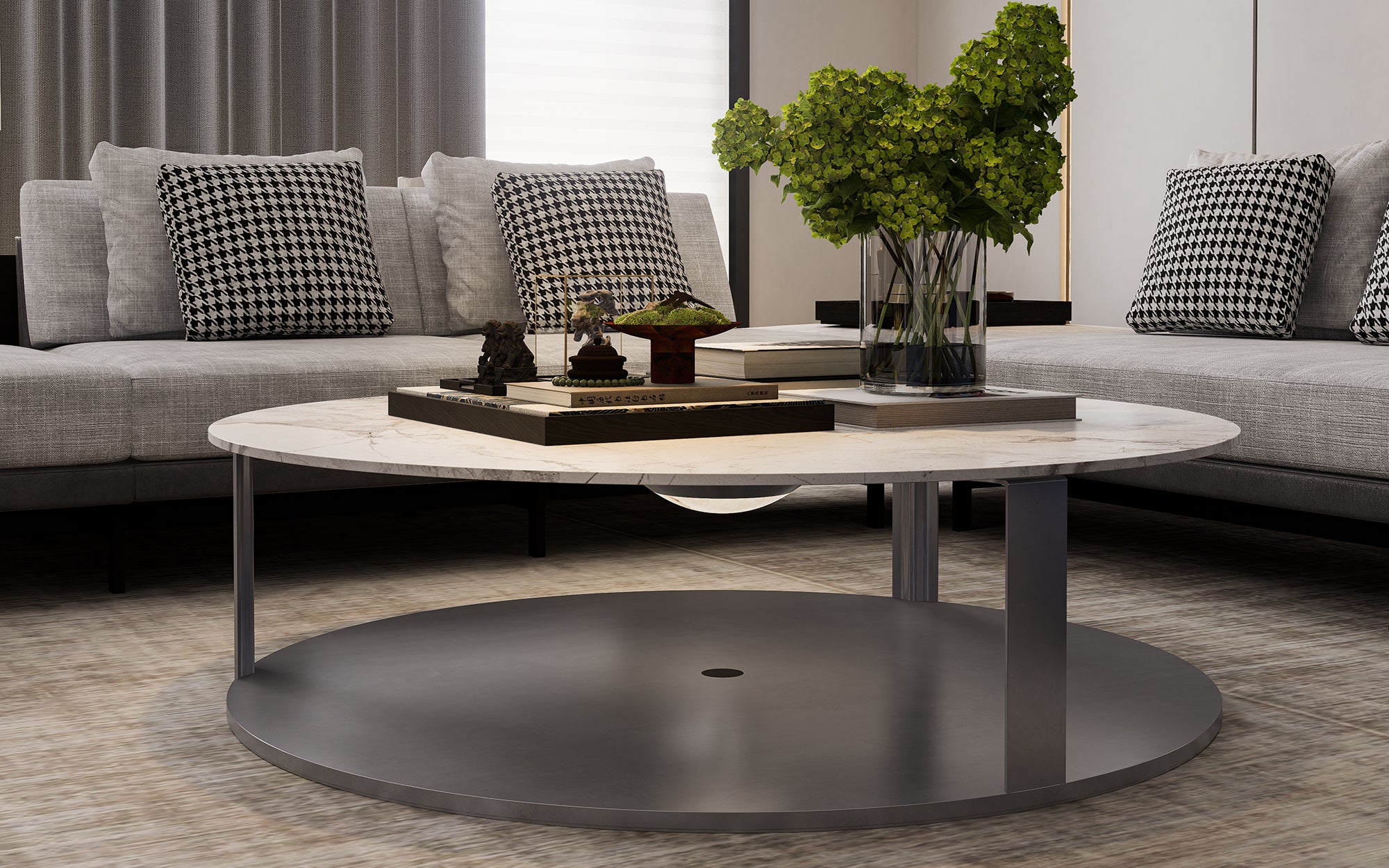 The FIT Coffee Table features a strong metal frame that supports your choice of a stone or wood surface, finished with several different options to suit your preference. The table's top is available in 18mm thickness for stone or wood, and 12mm for glass or metal. It also includes LED lighting both above and below the table, as well as a battery base and wireless charging capabilities.