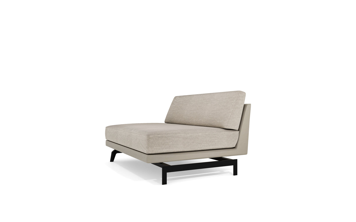 The reversible element and chaise longue make room rearranging easily. Its modern, tailored look dresses up your space. Covered in your choice of popular fabrics. Its clean-lined, minimalist shape & flanged edges. Body and seat in in flexible multi- density polyurethane and covered with fibre. Base in solid wood with inlaid metal. The upholstery is in fabric, saddle leather or leather. It is available in various colors, all completely removable.