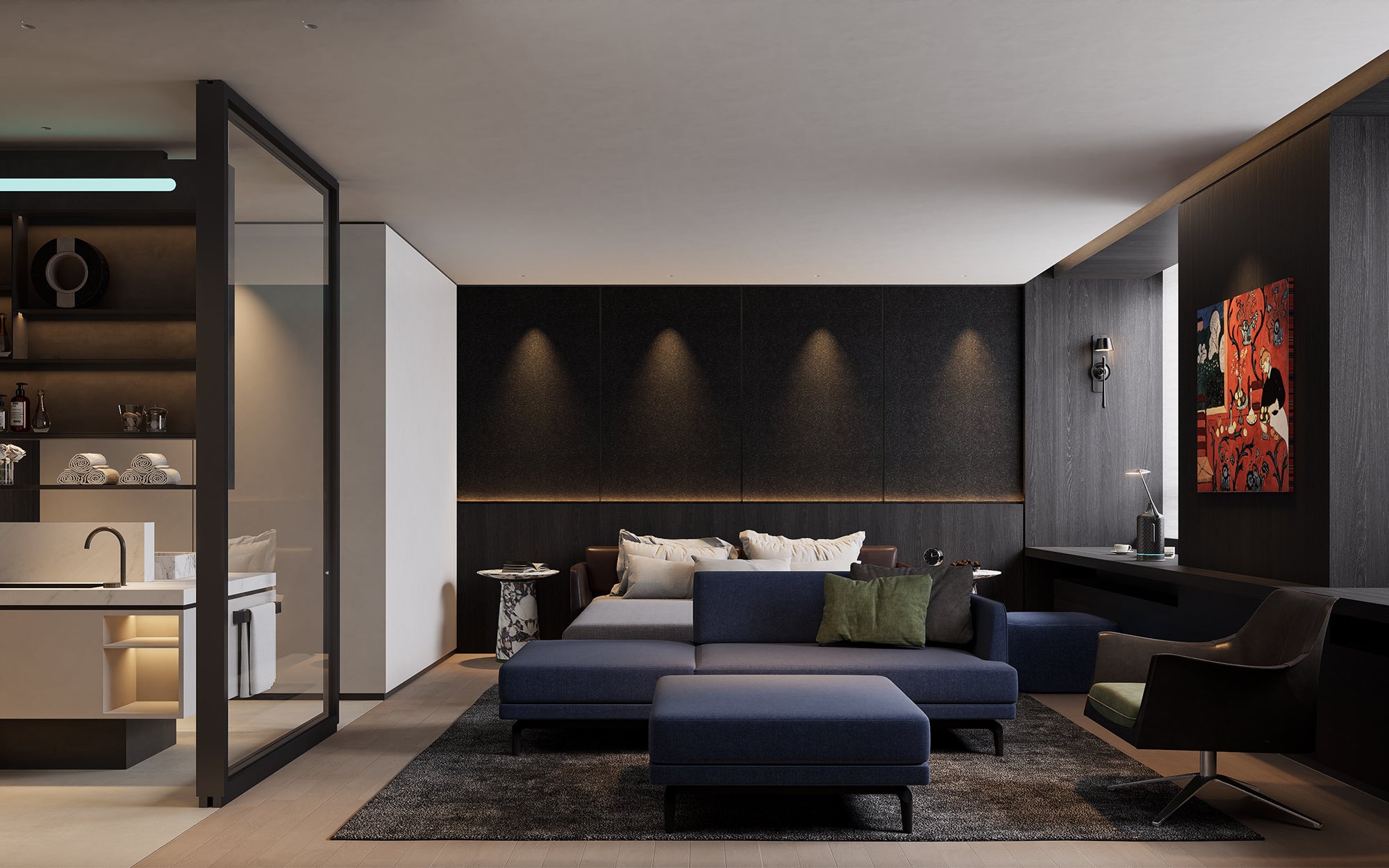 A series of sofas in solid wood structure with inlaid metal and removable fabric or leather upholstery.