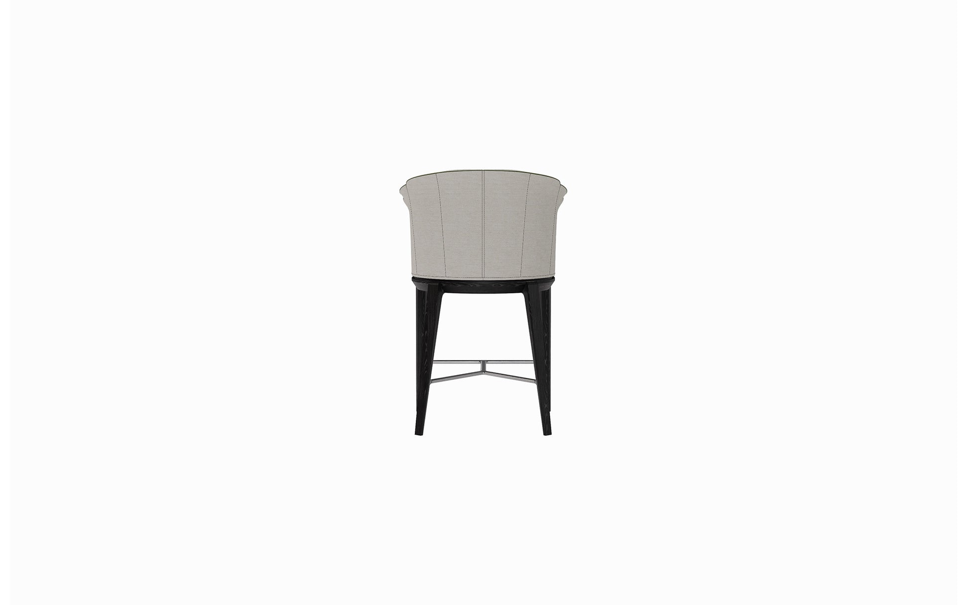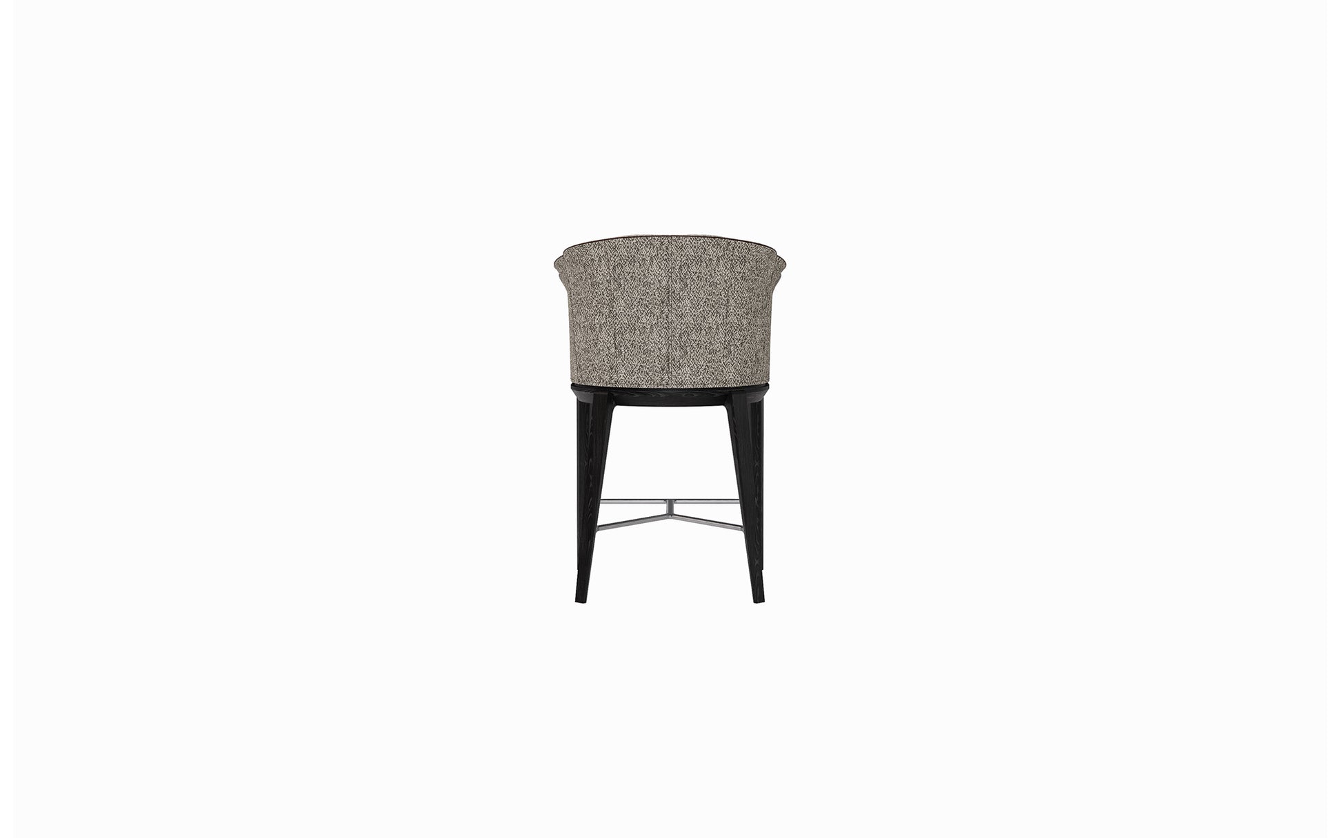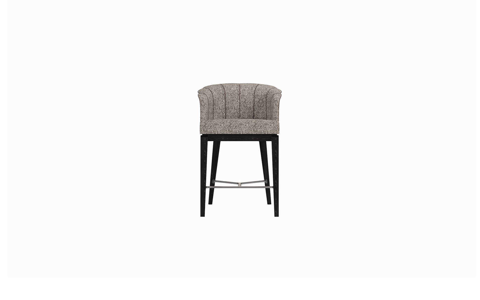 Laura Island Chair II, with a base in smoked elm or natural walnut and a metal footrest, and the structure of the back in curved plywood. The padding is in flexible multi-density polyurethane, covered with fibre. The upholstery of the back has special stripes that can be in saddle leather or leather, while the seat is always in fabric or leather. It is available in various colors, all completely removable. It's all designed to fit seamlessly into bar counters, kitchen islands, or casual dining spaces.