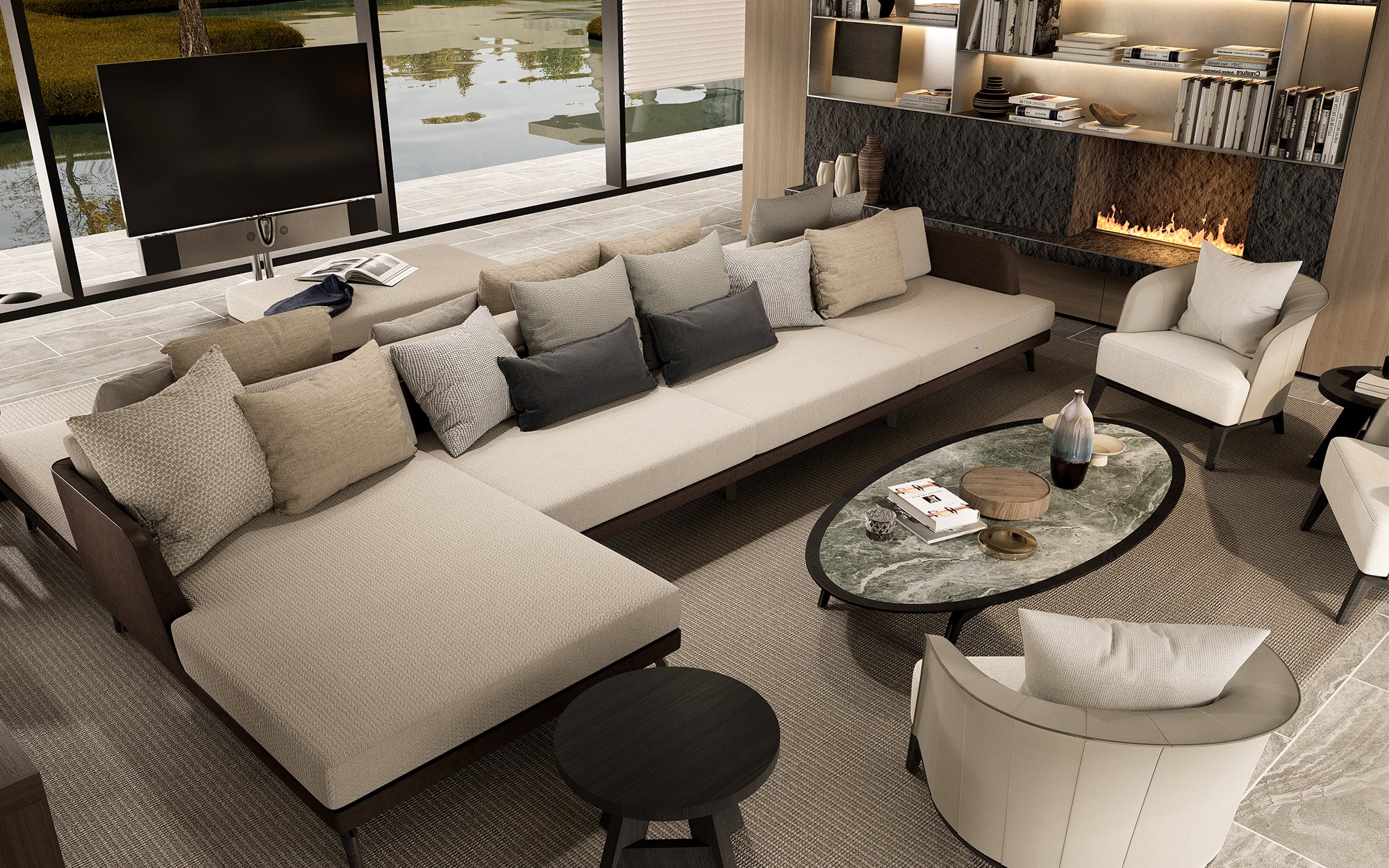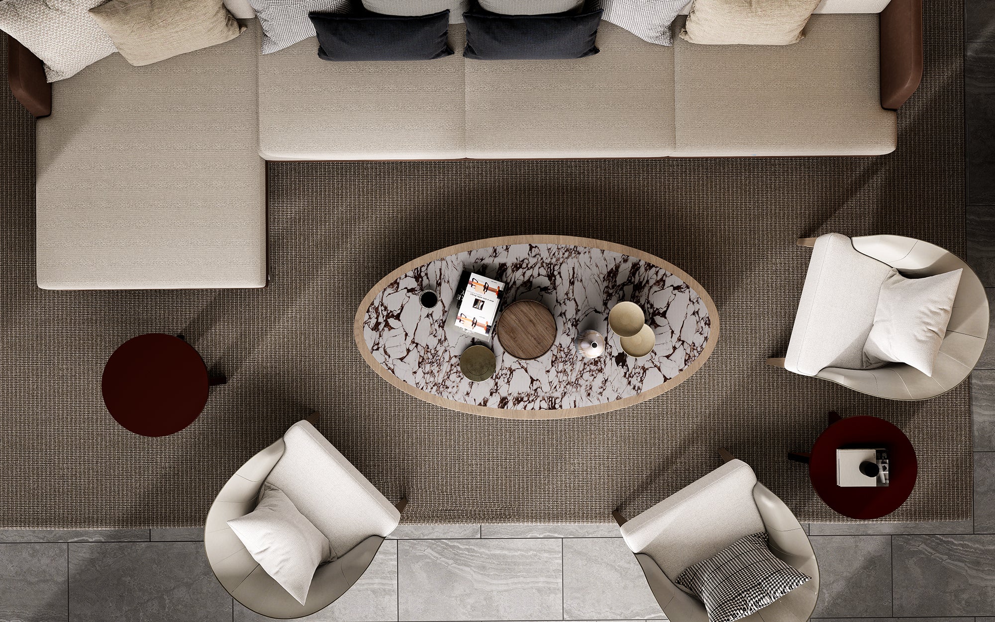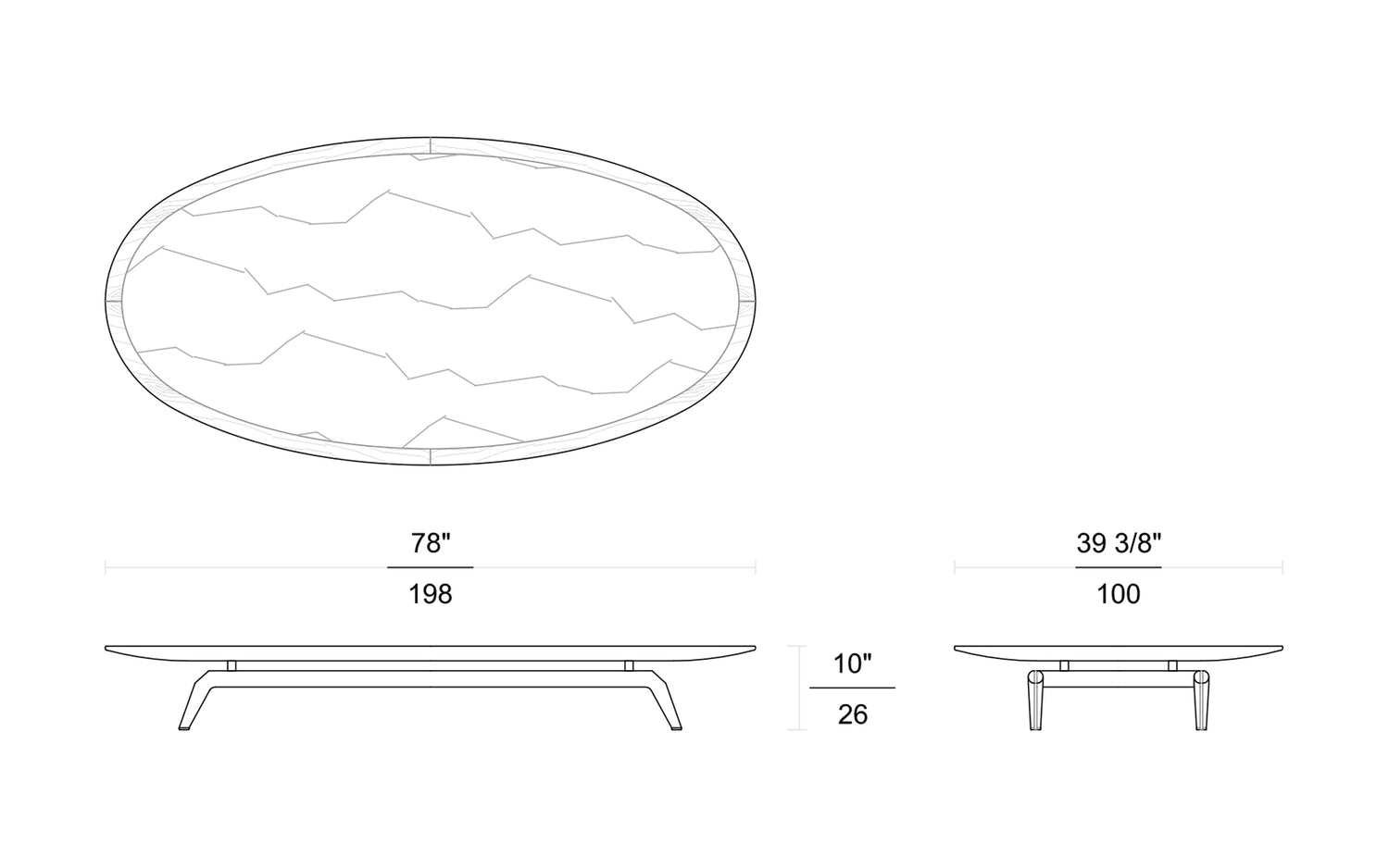 Trend Oval 咖啡桌采用木质结构,内嵌金属,有多种饰面可供选择。这些饰面包括木质贴面、皮革、石材和玻璃。在镶嵌台面版本中,人们可以欣赏到将镶嵌木质贴面、皮革、石材或玻璃融入木质框架的精湛工艺。