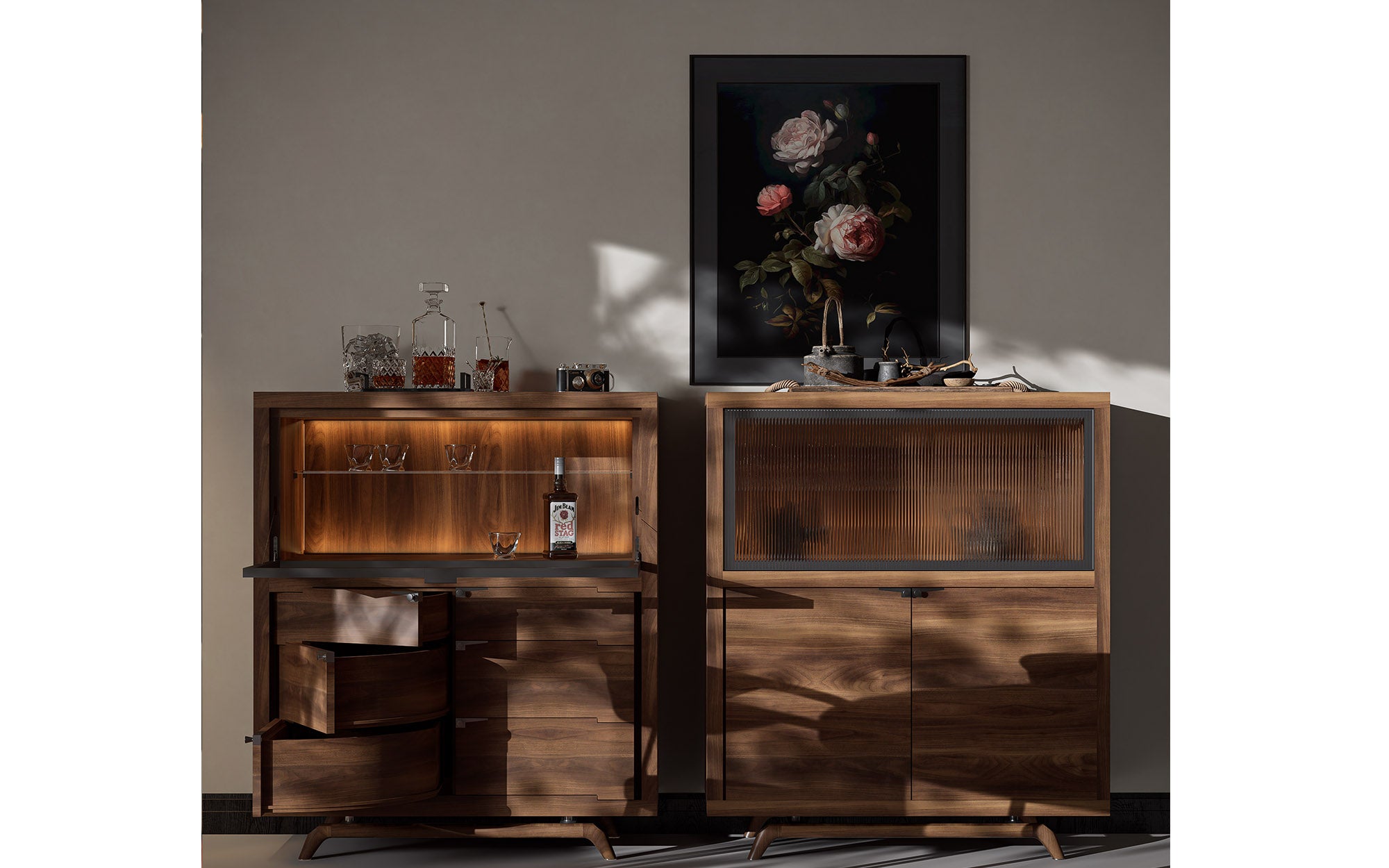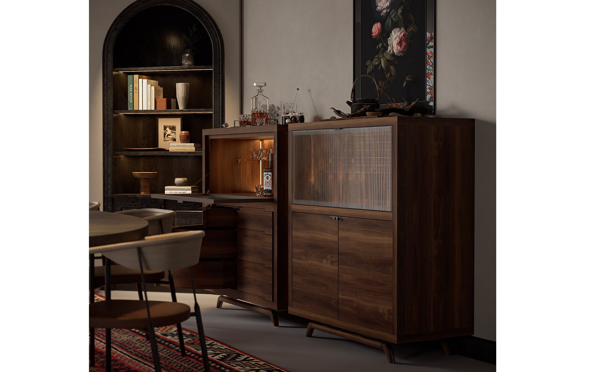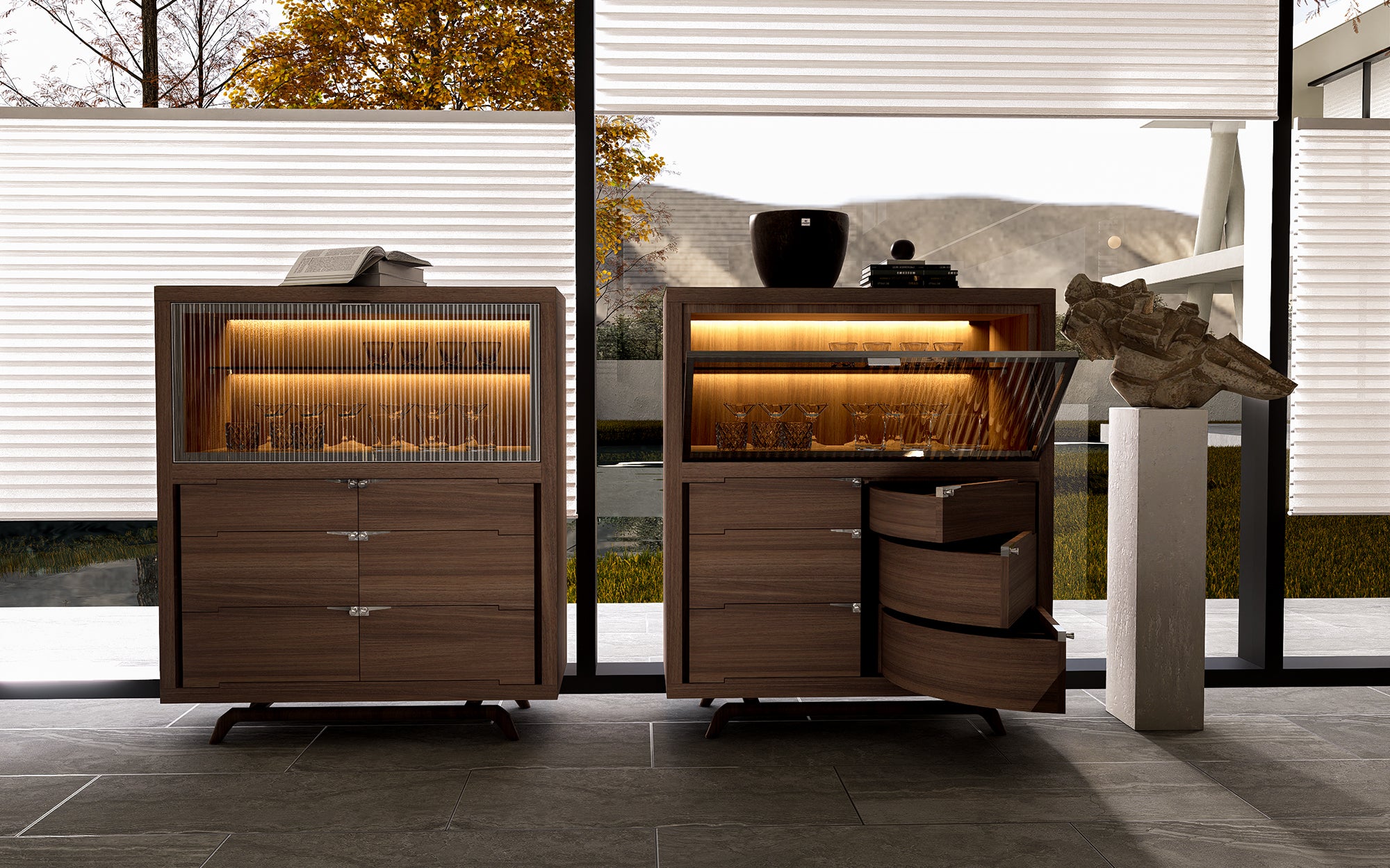 TREND 高餐边柜采用现代而优雅的设计,是理想的家居中心装饰品。这款高餐边柜采用天然胡桃木、酸枝木或烟熏榆木贴面的胶合板框架。上部隔间配有铝制框架翻盖玻璃门和可拆卸搁板,并配备 LED 照明。下部隔间有两种版本:一种是六个带旋转机构的小抽屉;另一种是带有旋转装置的六个小抽屉。其中一种有两扇门和四个可拆卸架子。所有手柄均采用金属材质。镶嵌金属的实木底座赋予低矮服务器现代的外观。您会看到一个非常精致的木工接头,它将使您的木制服务器坚如磐石。